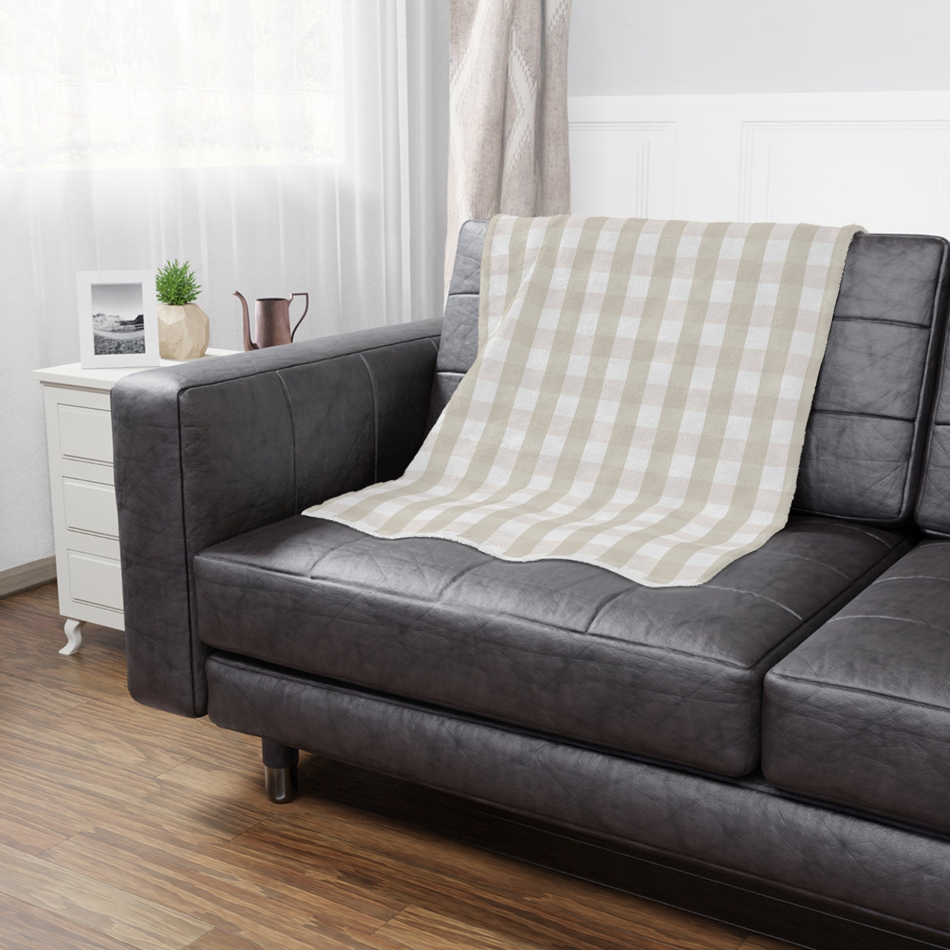 Chic and versatile, this tan checkered blanket is a perfect neutral accent for any space. Pair it with the optional matching throw pillow for a complete set (and automatically get $4.99 off). Also available in a soft and playful pink or seafoam green.