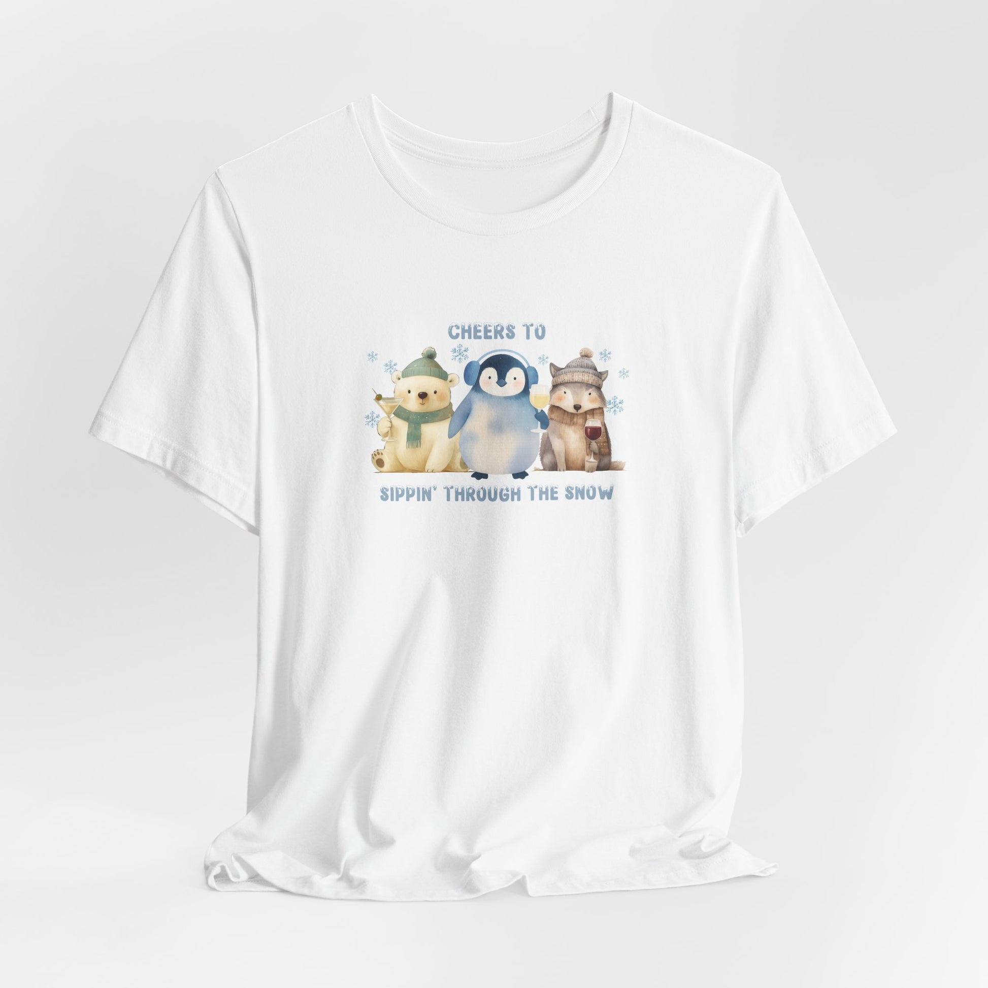 Raise a glass to holiday cheer with this fun Cheers to Sippin’ Through the Snow t-shirt! Featuring three adorable snow animals sipping martinis and wine, this Bella + Canvas unisex tee is soft, lightweight, and perfect for festive gatherings, holiday parties, or cozy nights by the fire. Designed for comfort and style, it makes a playful gift for friends, family, or anyone who loves winter vibes with a splash of humor.
