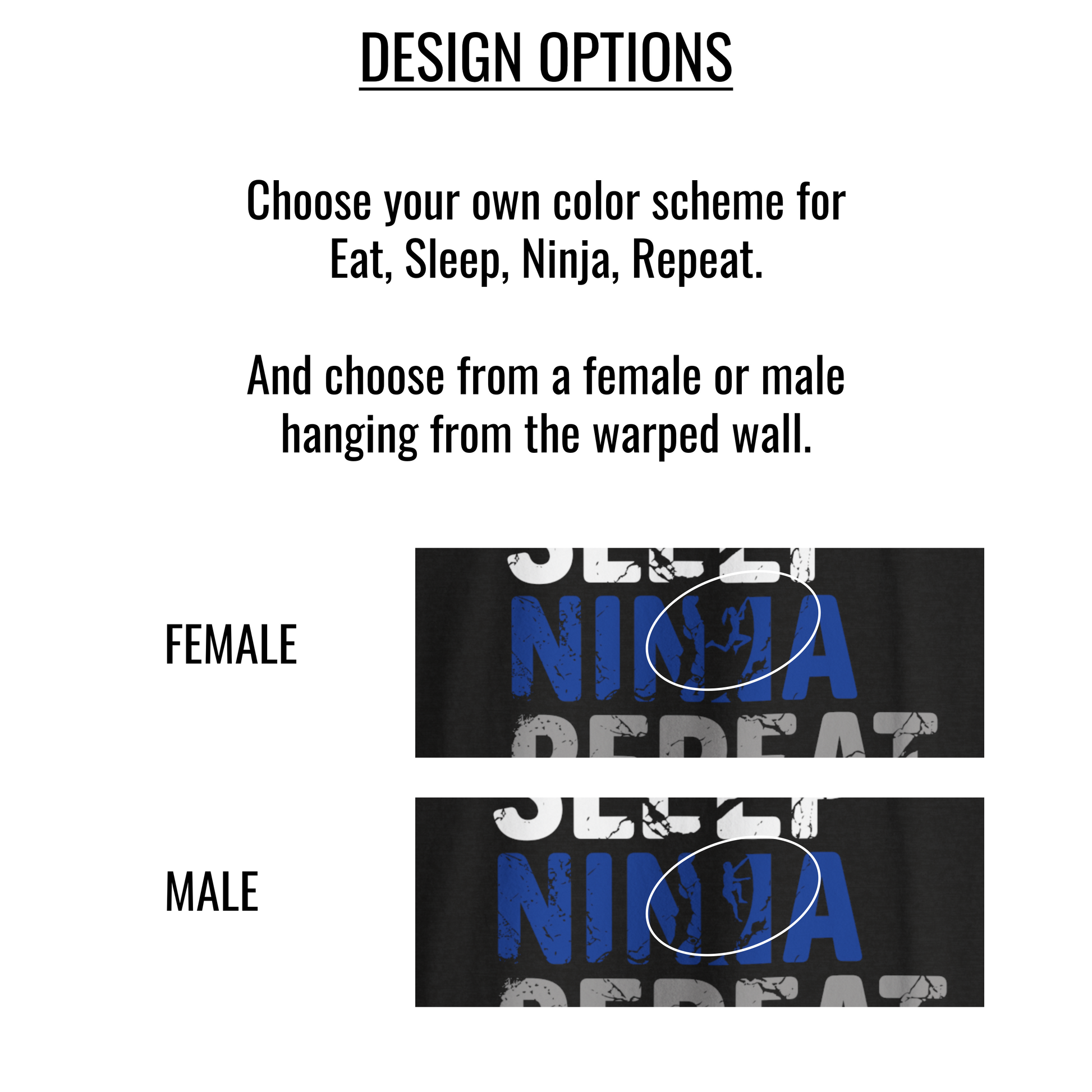 A fresh spin on a classic favorite. This Eat Sleep Ninja Repeat t-shirt reworks the original design with bold, distressed lettering and a signature warped wall built directly into the word Ninja. A climber hangs from the wall—available with either a male or female figure—representing the grit, strength, and determination of the ninja lifestyle.