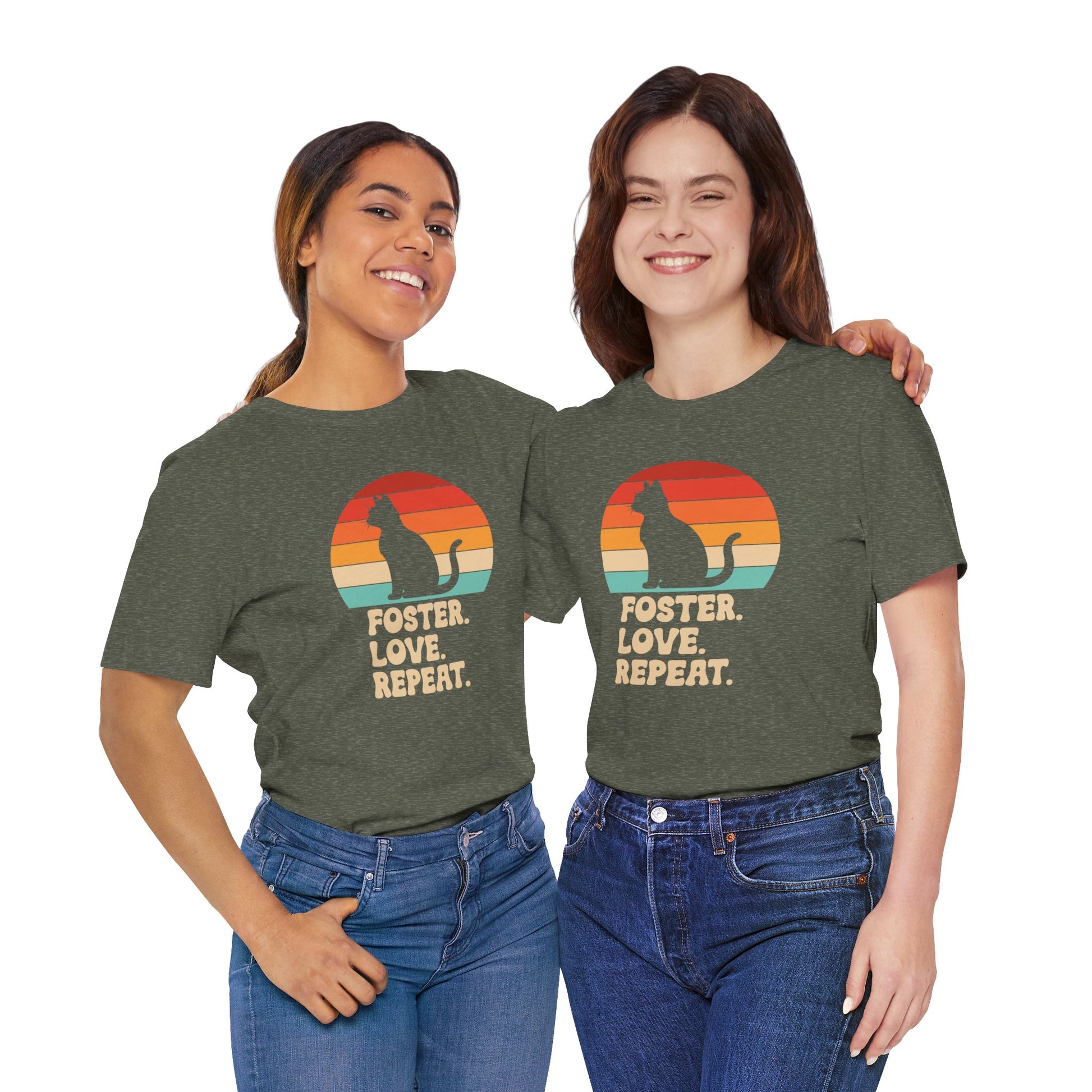 Show your love for rescue animals with this vintage-inspired retro sunset t-shirt. Featuring three unique designs – a cat silhouette, a dog silhouette, and a classic paw print – this shirt is perfect for foster families, animal rescue supporters, and pet lovers alike. With its warm retro colors and bold “Foster. Love. Repeat.” message, it’s a meaningful and stylish way to share your passion for saving lives.
